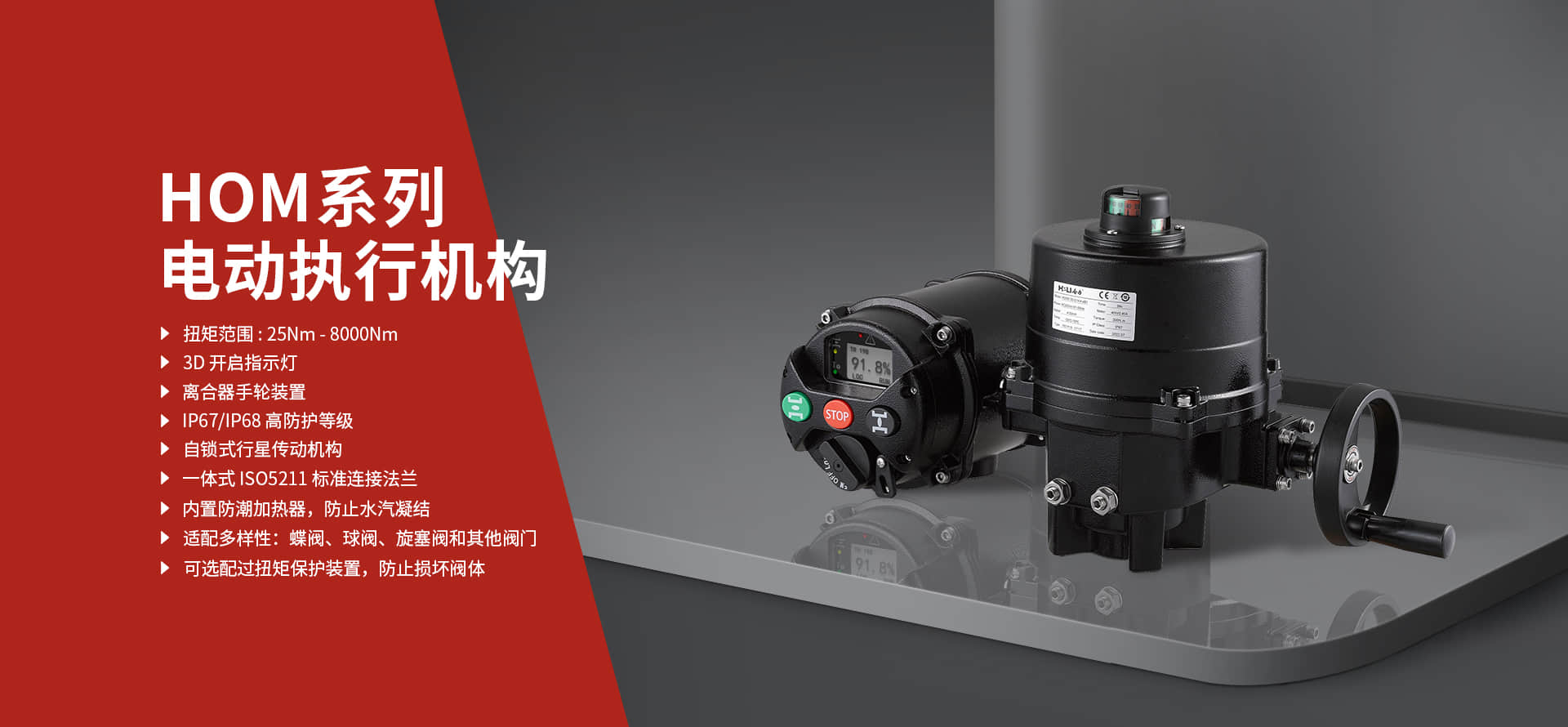 HOM系列帶行星齒輪的部分回轉(zhuǎn)電動執(zhí)行機構(gòu),用于機械傳動。輸出扭矩為25~8000NM,無離合器手動操作。手動和電動分別操作。它在沒有手柄或離合器的情況下很容易操作,當電源打開時,你可以轉(zhuǎn)動手輪。電動執(zhí)行機構(gòu)可與蝶閥、球閥、旋塞閥組合,廣泛應用于發(fā)電廠/冶金廠/污水處理廠/樓宇自動化/城市管網(wǎng)等管道系統(tǒng)